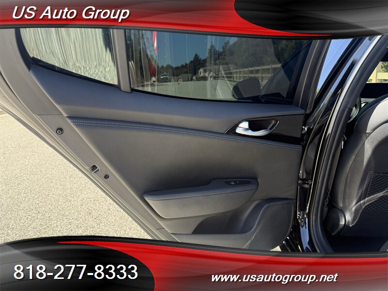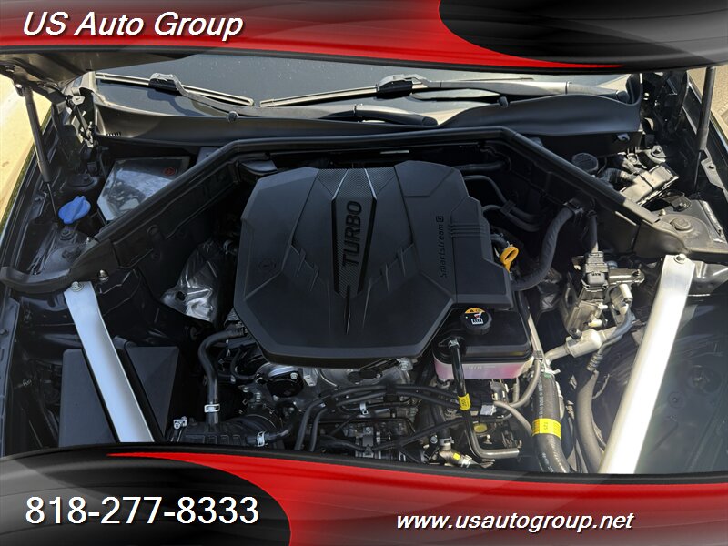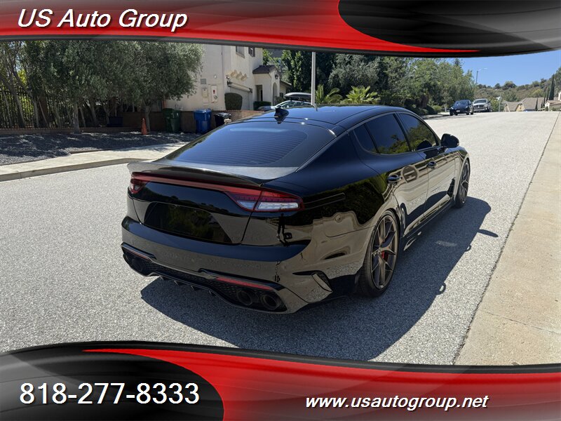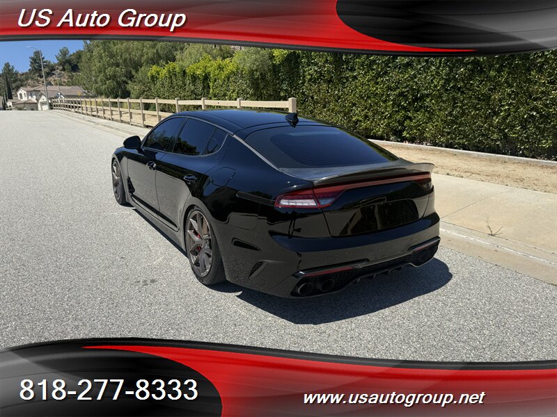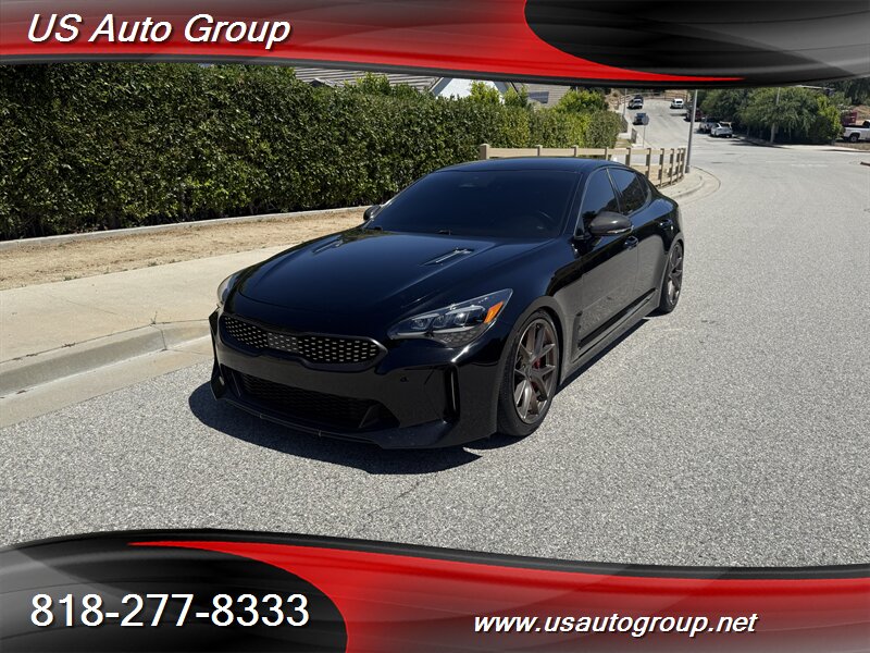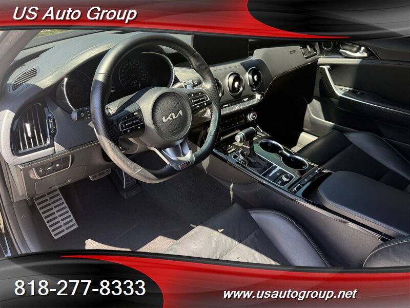 2022 Kia Stinger GT-Line finished in Aurora Black Pearl with a black interior. Powered by a 2.5L turbocharged inline-4 producing 300 hp and 311 lb-ft of torque, paired with an 8-speed automatic transmission. EPA-rated at 22 MPG city / 32 MPG highway.